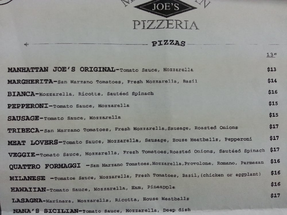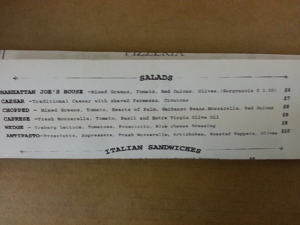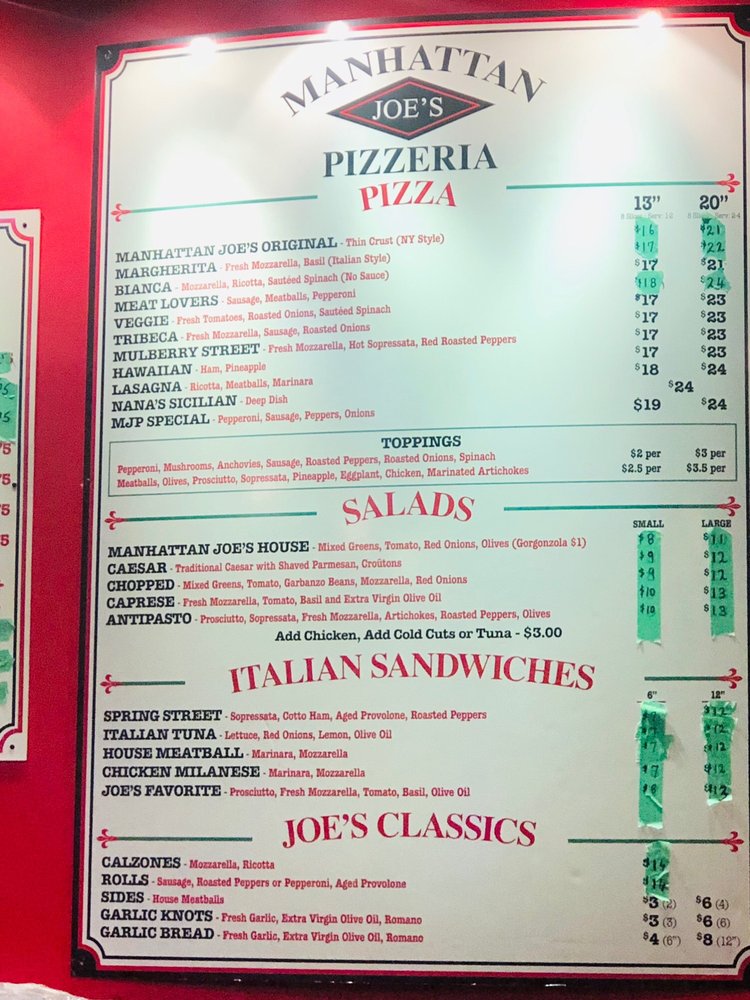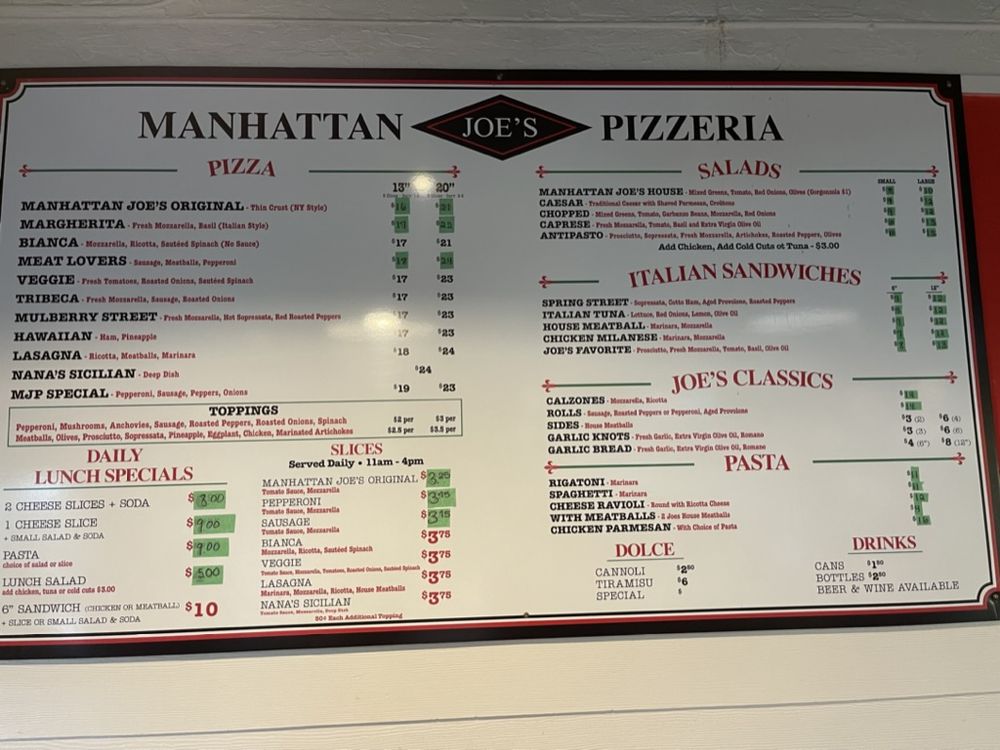 - Large and Small Pizzas: From the iconic 20" Manhattan Joe’s Original to the unique Lasagna Pizza, there's a pie for every palate.
